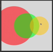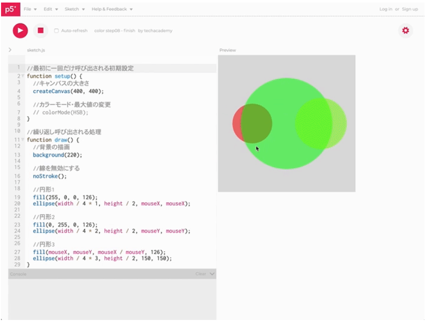 円の大きさと色にmouseXとmouseYを書いています。これにより実行している間、キャンバス内のマウスの位置の値になります。マウスを右に移動させると、左の円が大きくなります。 マウスを下に移動させると、真ん中の円が大きくなります。右の円はマウスの位置に応じて色が変化します。