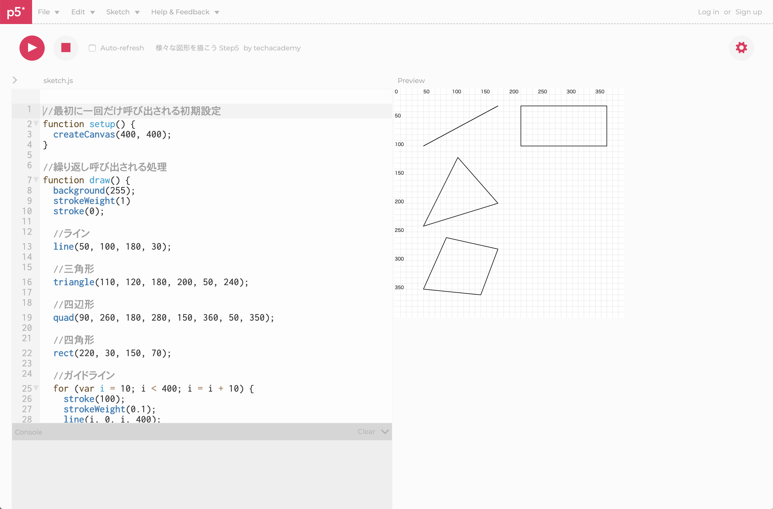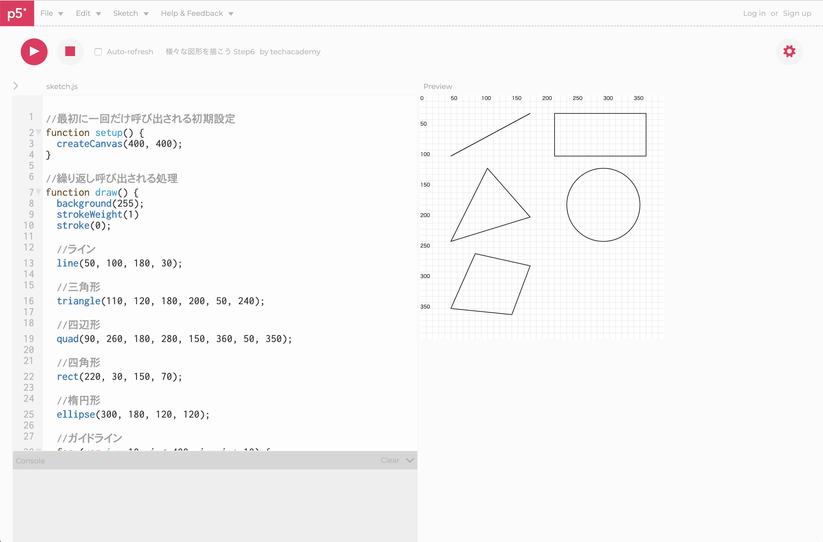 なんども同じプログラムを書くことなく、繰り返し処理を記述できます。詳細は後ろのレッスンで習得できるよ。現在は今回の目安線や座標の数値のように繰り返し描画に使えるんだと覚えておこう
