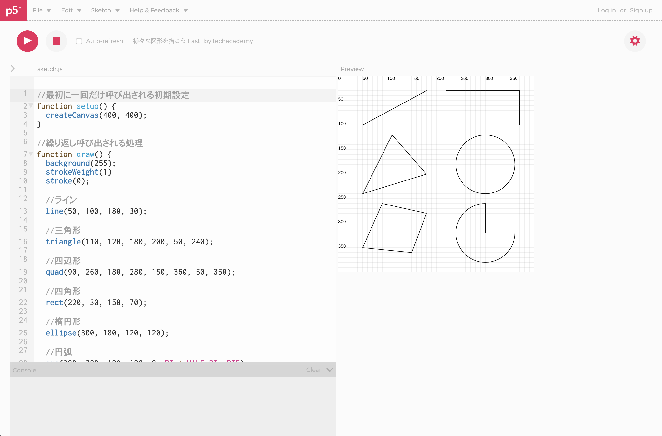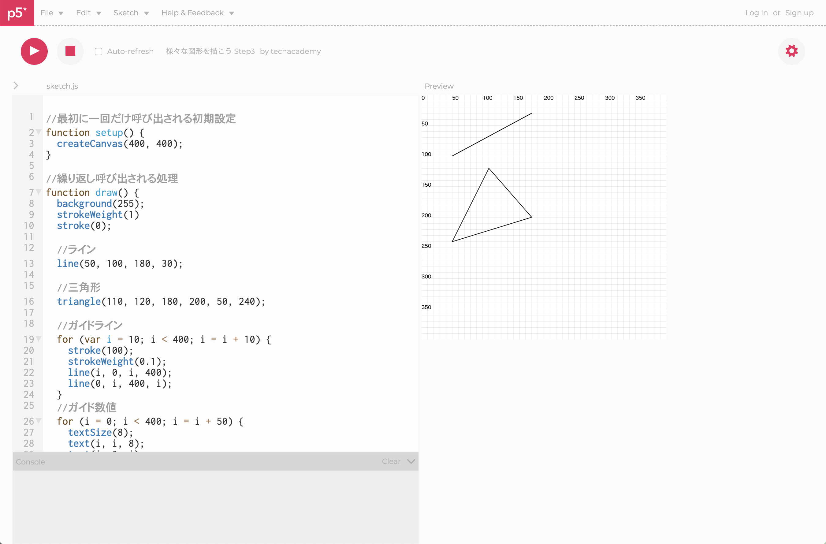 ラインの下に triangle(110, 120, 180, 200, 50, 240); を追加しよう