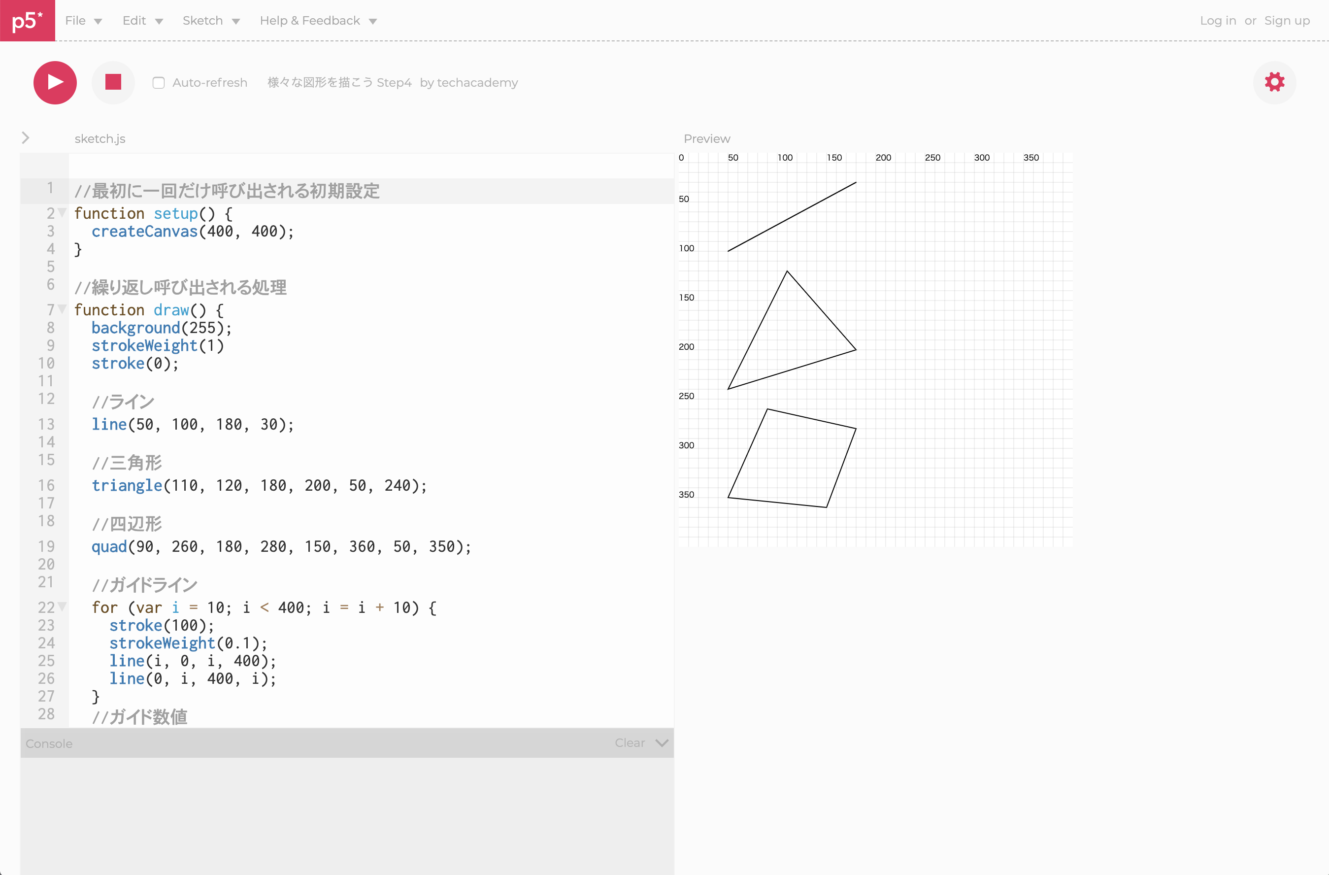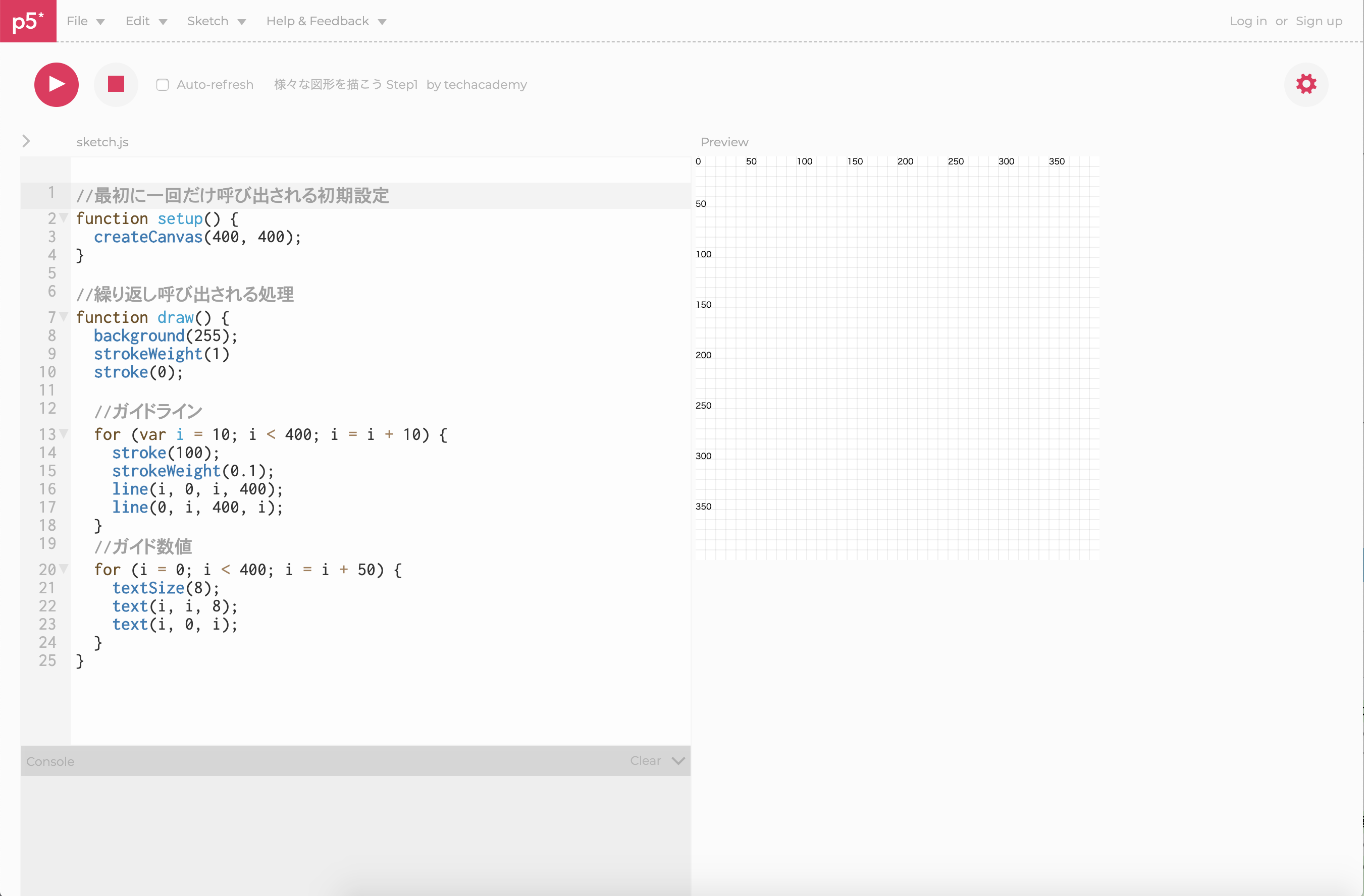 まずは、線を描画するよ。今回は座標の指定も重要になるので、座標のガイドラインもくり返し文を使って描画することにしよう。