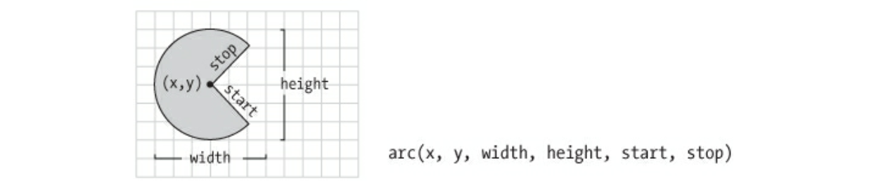 画面に円弧を描きます。x、y、w、h、start、stopのみで呼び出された場合、円弧は開いたセグメントとして描画され、塗りつぶされます。