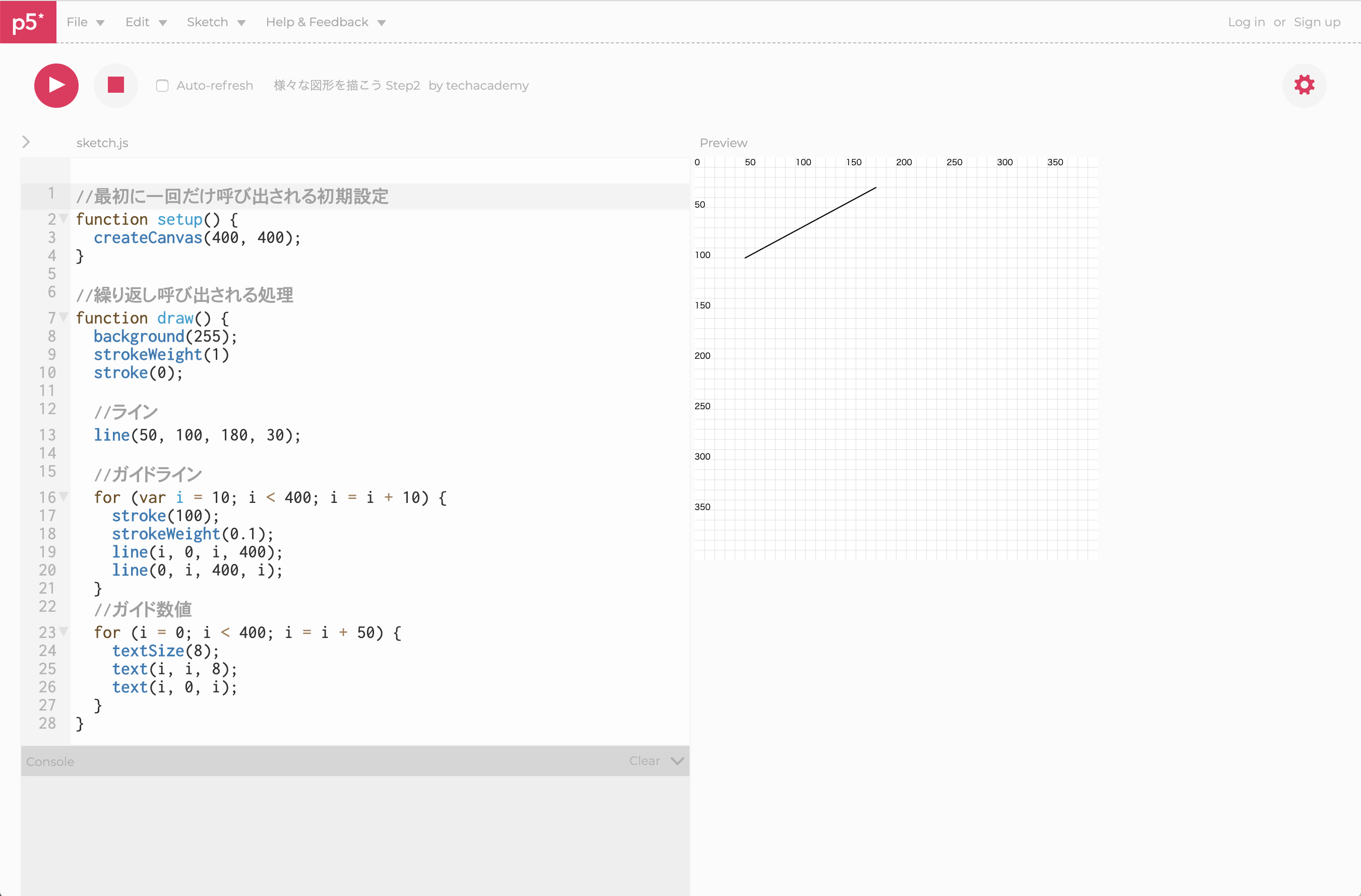 ガイドラインの上に line(50, 100, 180, 30); を追加しよう