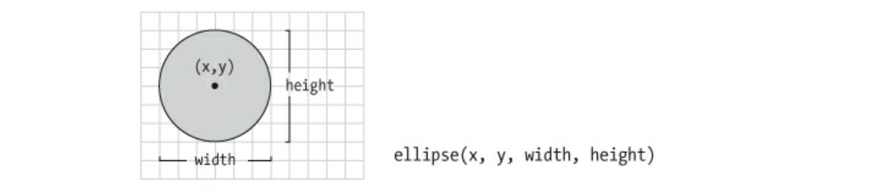 スクリーンに円(楕円)を描きます。幅と高さが等しい楕円形は正円です。最初の2つのパラメーターで位置を設定し、3番目と4番目のパラメーターで図形の幅と高さを設定します。