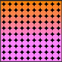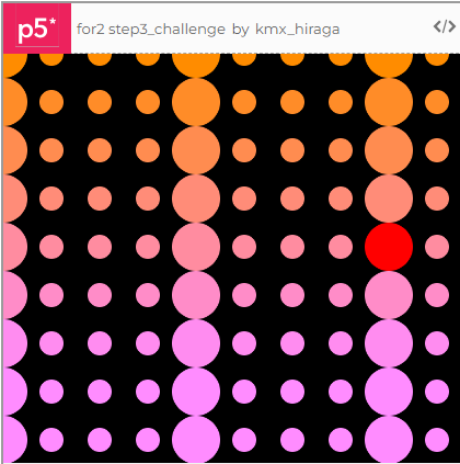 xが使われており、13行目のellipseのX座標を40ずつ増やしていることになります。つまり横方向に円を並べています。また10行目のfor文ではyが使われており、13行目のellipseのY座標を40ずつ増やしていることになります。つまり縦方向に円を並べています。
