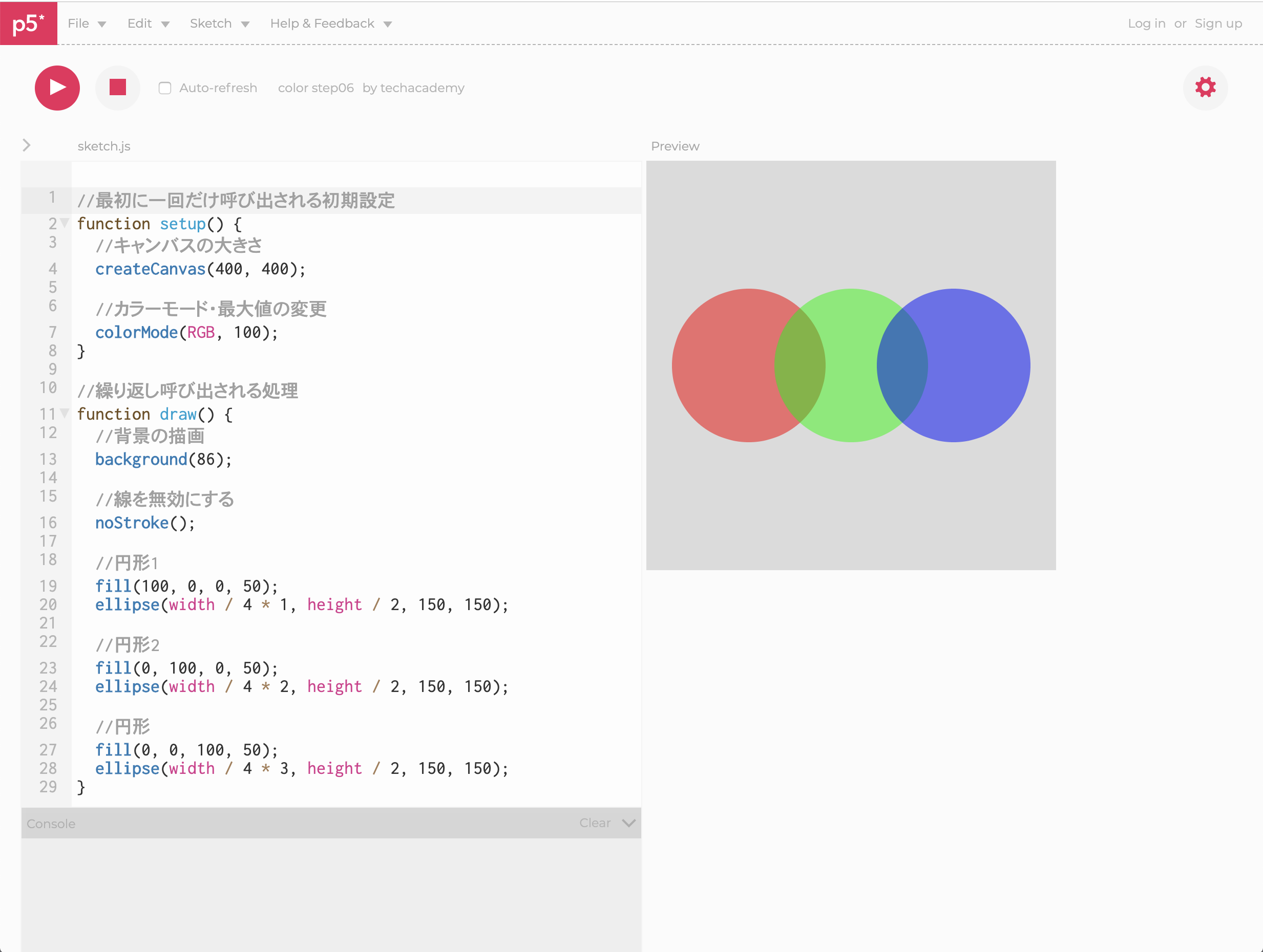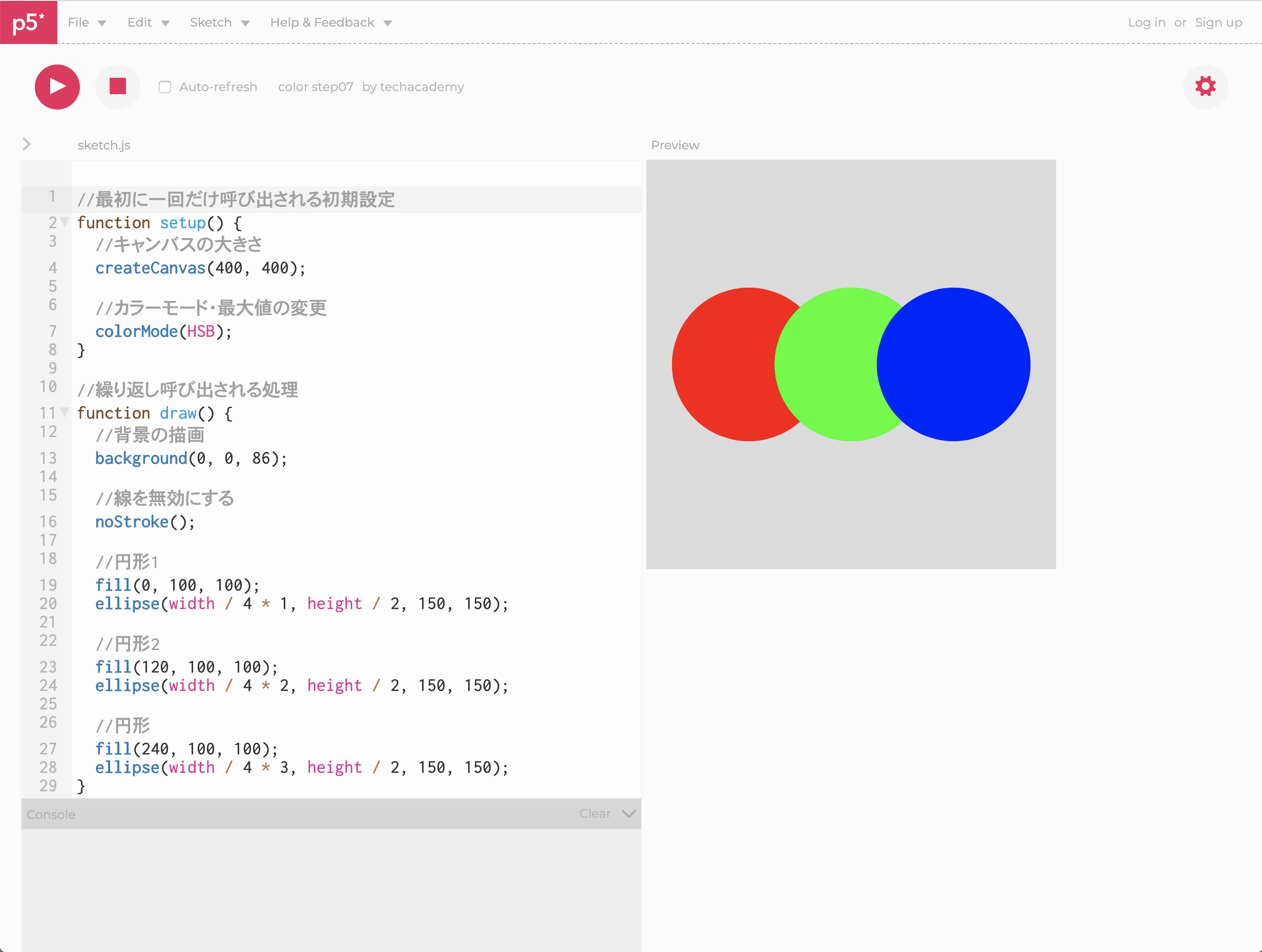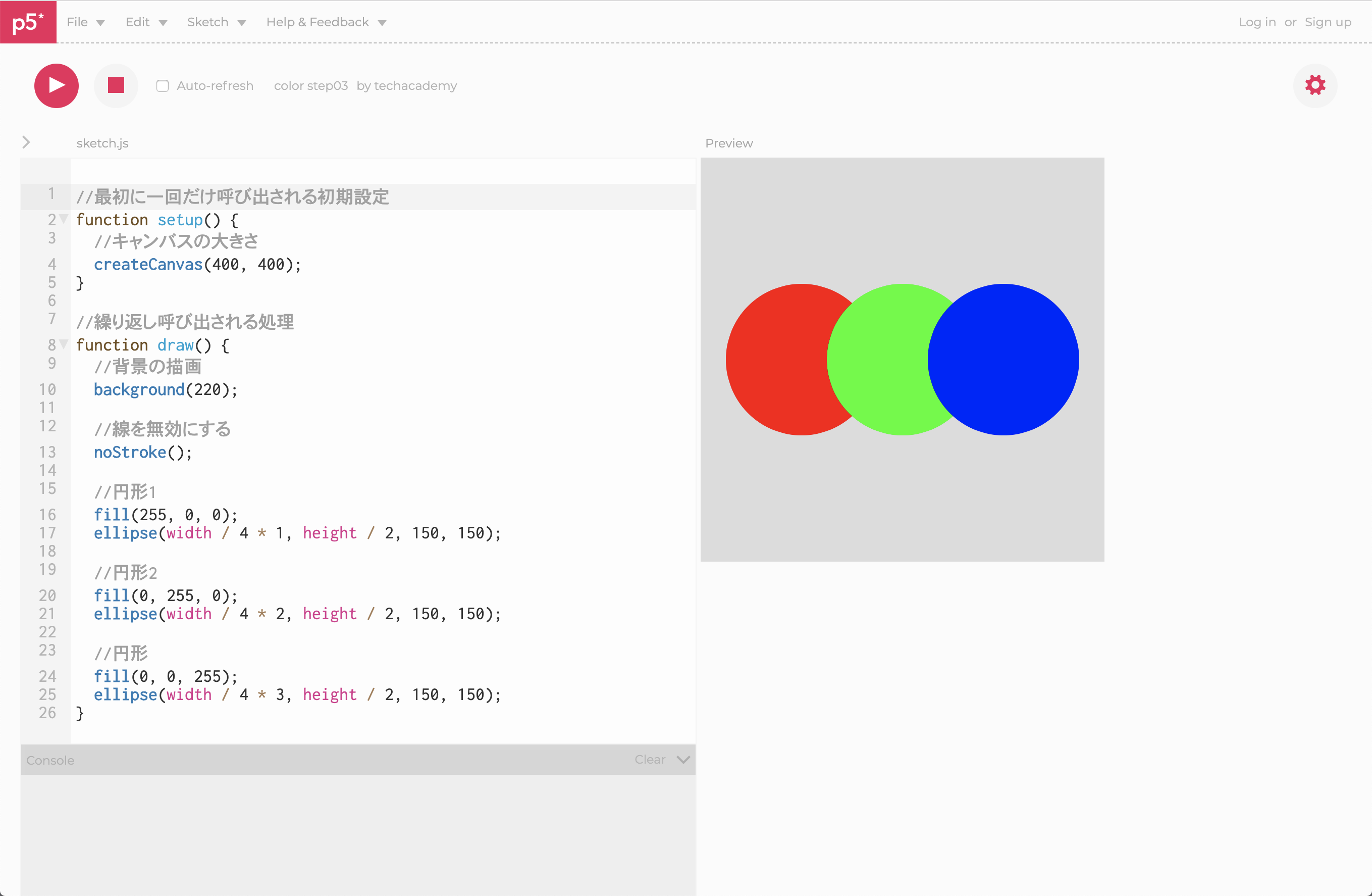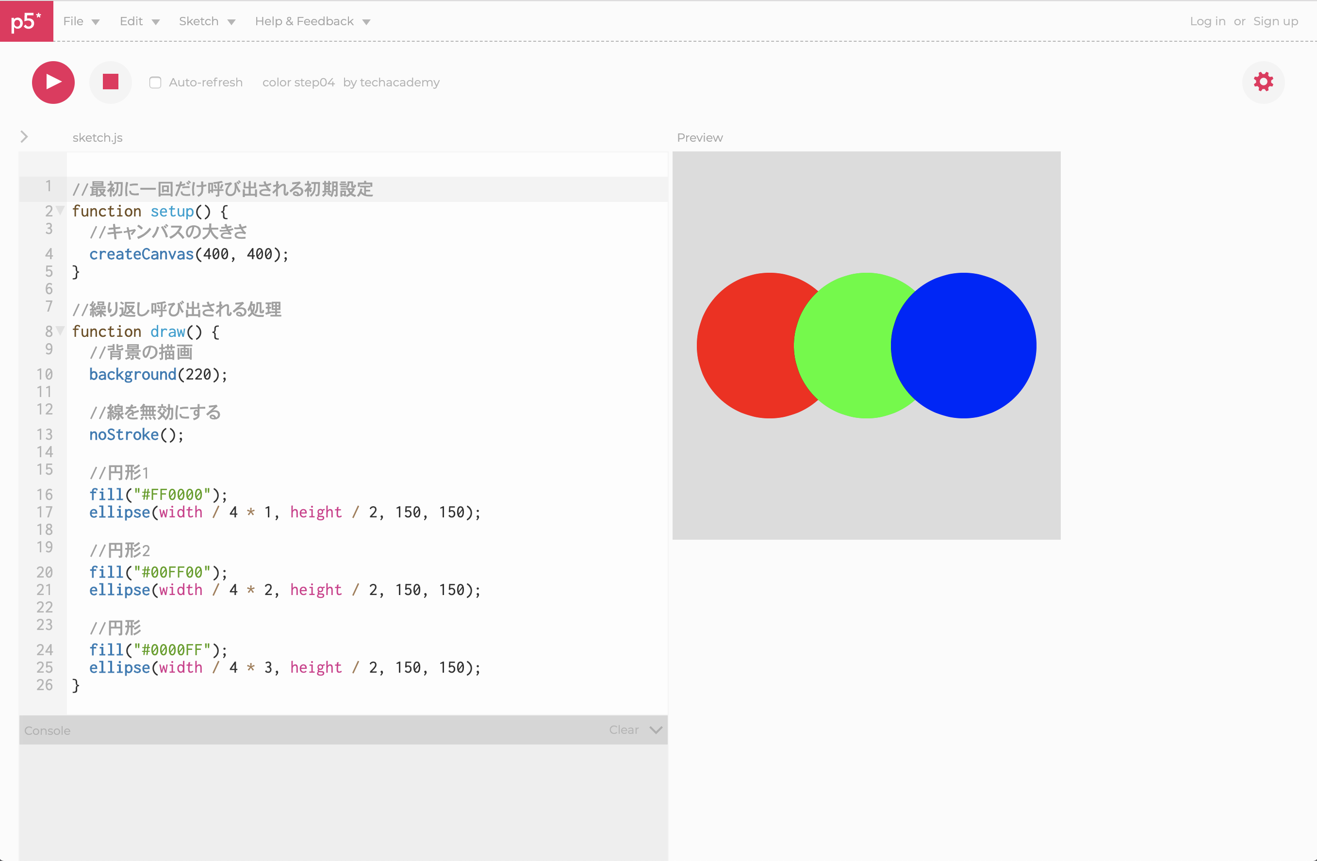 255, 0, 0 を "#FF0000" に、 0, 255, 0 を "#00FF00" に、 0, 0, 255 を "#0000FF" に変更してみよう。