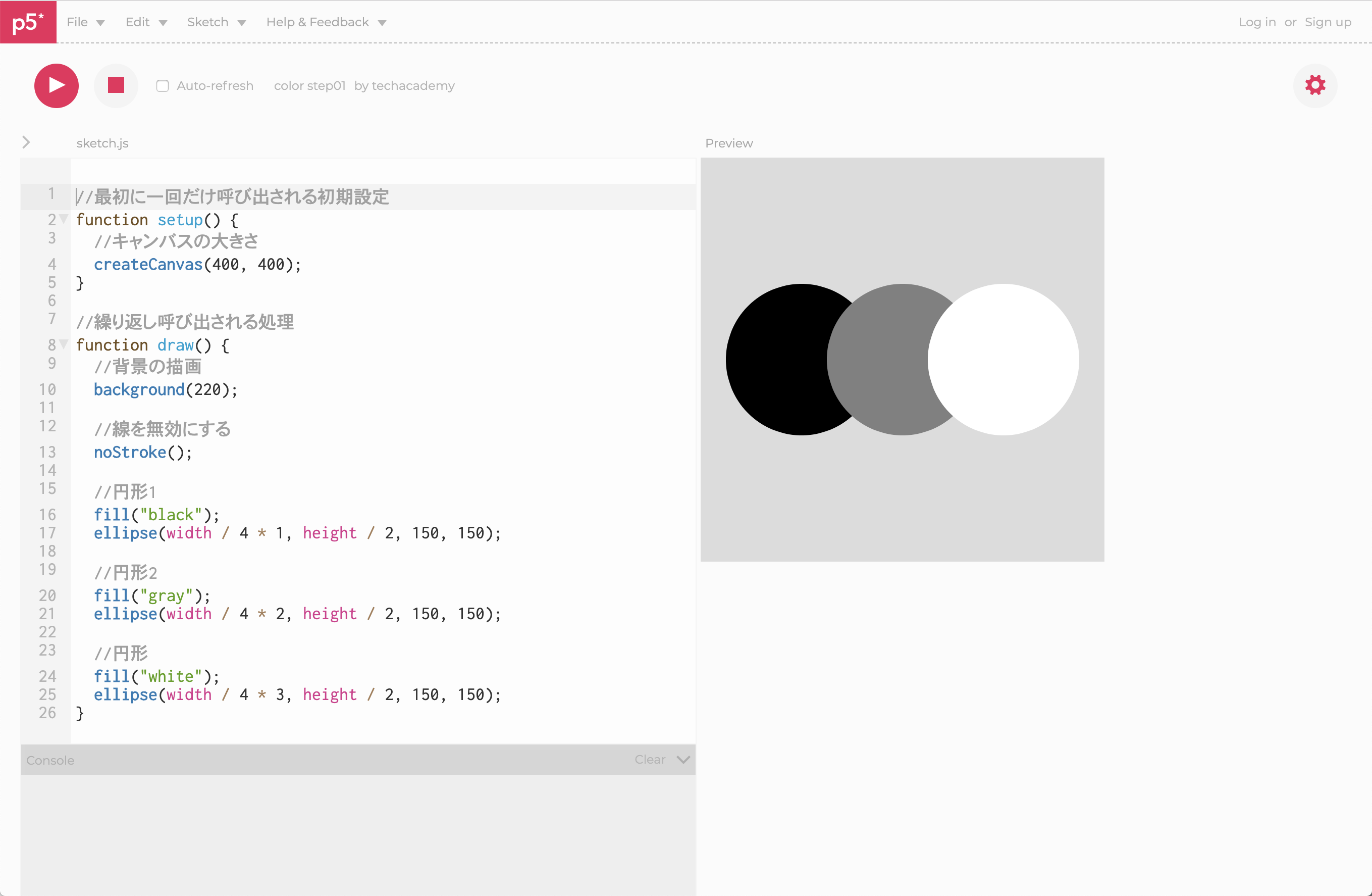黒(black)・灰色(gray)・白(white)の円形3つが表示されたらOKだよ