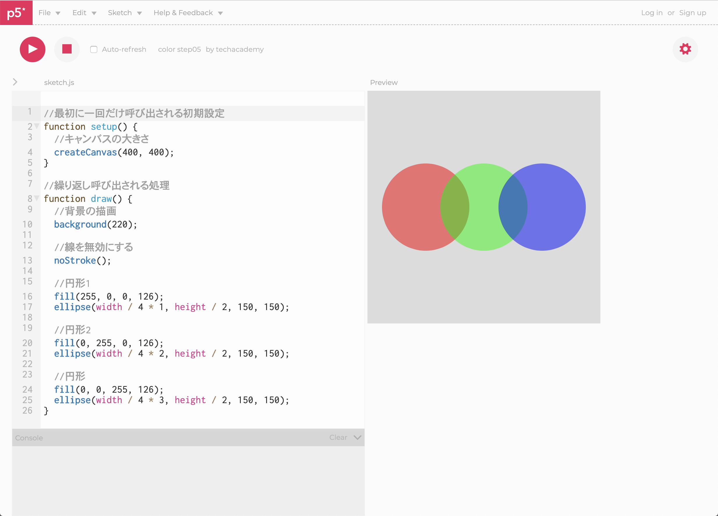 例えば、width / 4 * 2は、「横幅を4で割って2倍する」という意味で、キャンバスの大きさに関係なく、真ん中に円の中心がくることになります。便利な書き方なので慣れておくと良いでしょう。