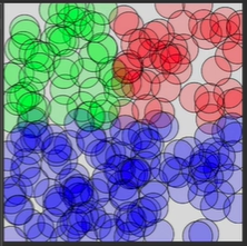 円のX座標とY座標がどちらもランダムな数字となったので、キャンバスの全体に円が描かれるようになります。
